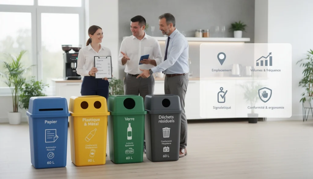 Adaptez le volume des bacs à la fréquentation des lieux. En open space, 60 à 90 litres par flux suffisent. En restauration ou en zone de production, visez 90 à 120 litres minimum. Une poubelle de tri sélectif trop petite déborde rapidement et nuit à l’hygiène. À l’inverse, un bac trop grand peut être encombrant et dissuasif dans les petits espaces.